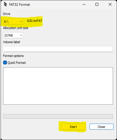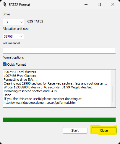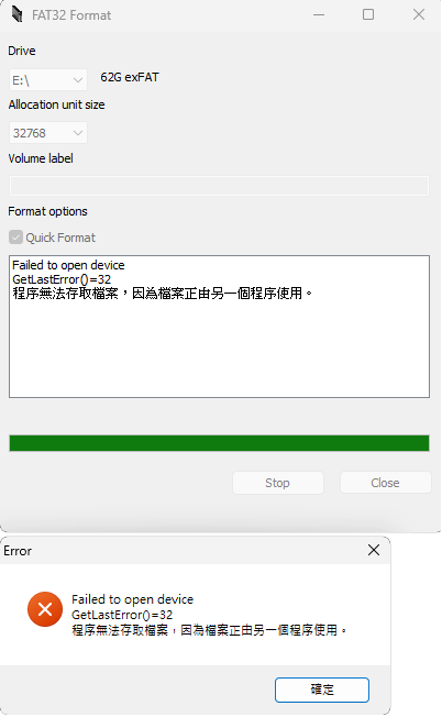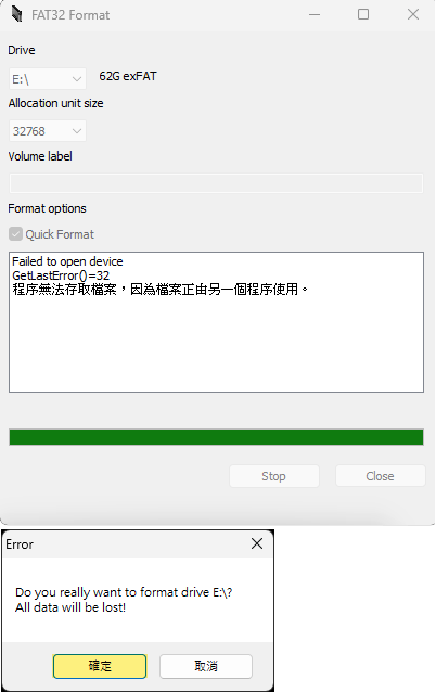 Refresh:確認要格式化的記憶卡磁碟槽是否正確 Capacity:確認要格式化的記憶卡容量是否正確 Quick format:快速格式化 Format:開始格式化 使用 GuiFormat 將 exFAT 格式化為 FAT32 Driver:確認要製作FAT32的記憶卡磁碟槽,後面有其容量及目前格式 Start:確認沒問題,按Start開始製作 ※如果出現以下對話 請先用 Windows 系統內建的格式化程式, 格式化後,再重複上述操作一遍即可。 完成 按Close