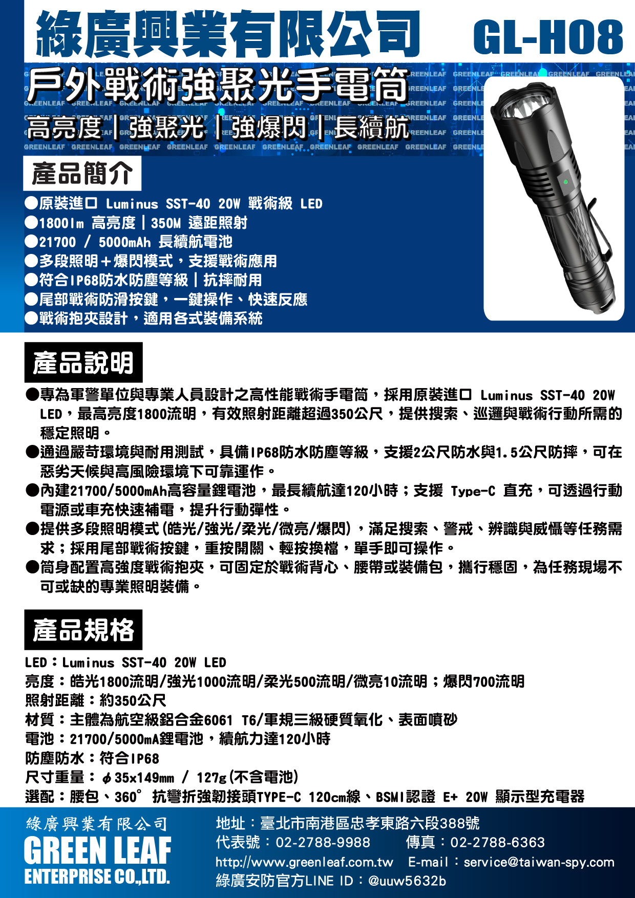 ●專為軍警單位與專業人員設計之高性能戰術手電筒,採用原裝進口 Luminus SST-40 20W LED,最高亮度1800流明,有效照射距離超過350公尺,提供搜索、巡邏與戰術行動所需的穩定照明。