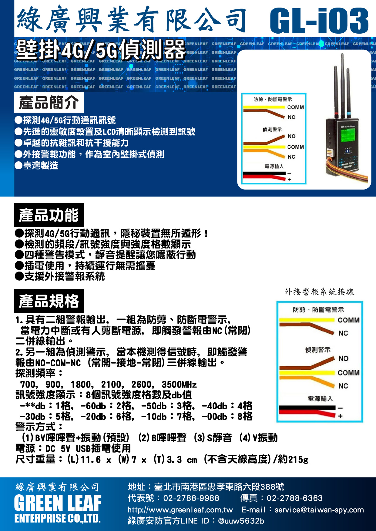 本機對GSM/3G/4G/5G(3300~3700MHz)手機信號具有良好的檢測能力,包括GSM/3G/4G/5G音頻監控和3G/4G/5G視頻監控。