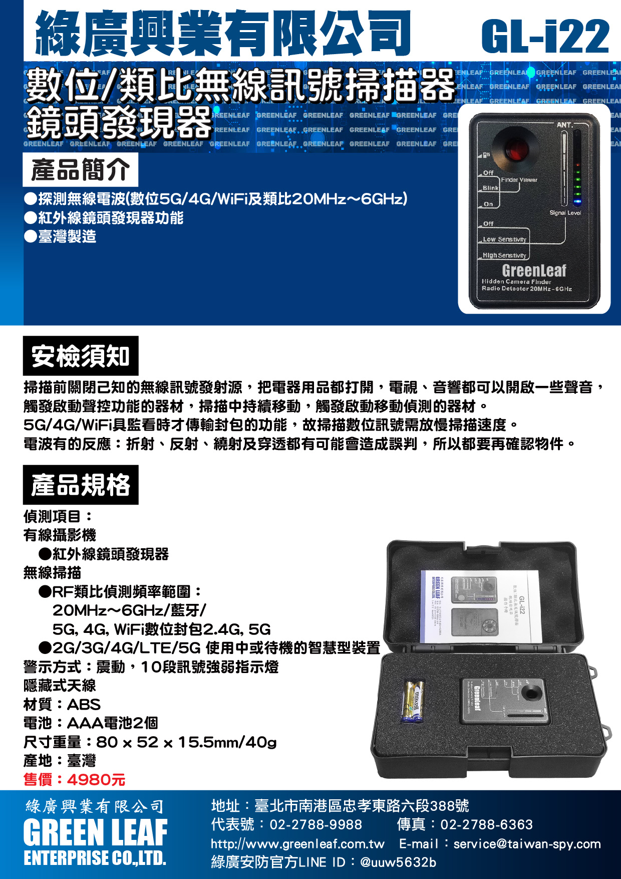 ●探測無線電波(數位5G/4G/WiFi及類比20MHz~6GHz)
