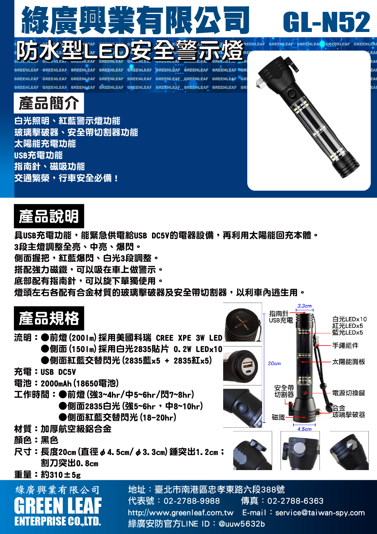 具USB充電功能,能緊急供電給USB DC5V的電器設備,再利用太陽能回充本體。
