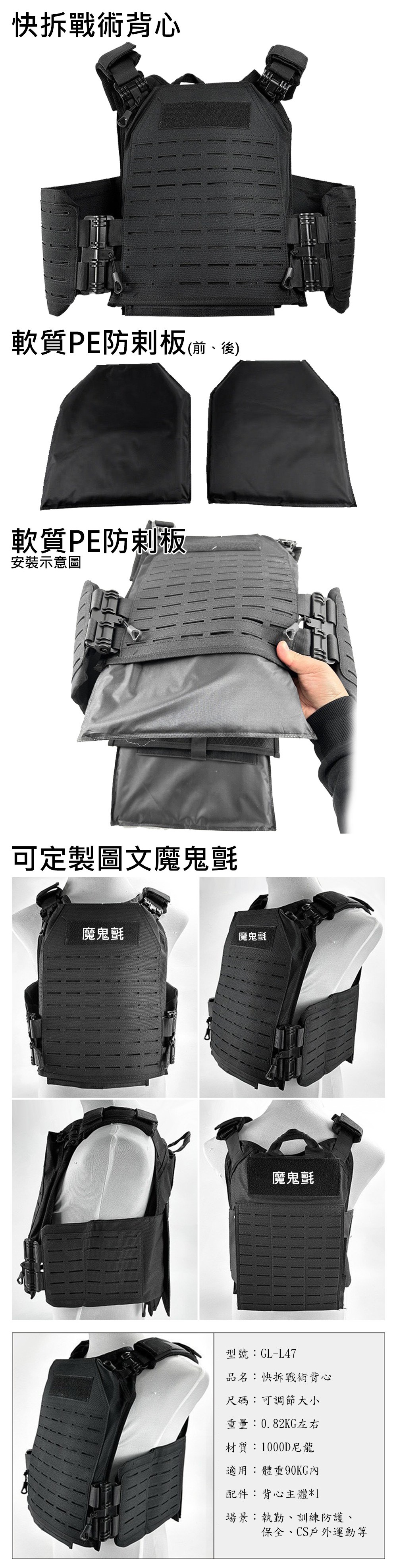 戰術背心可插入防彈板、防剌板等,提供防護與模組化裝備配置
